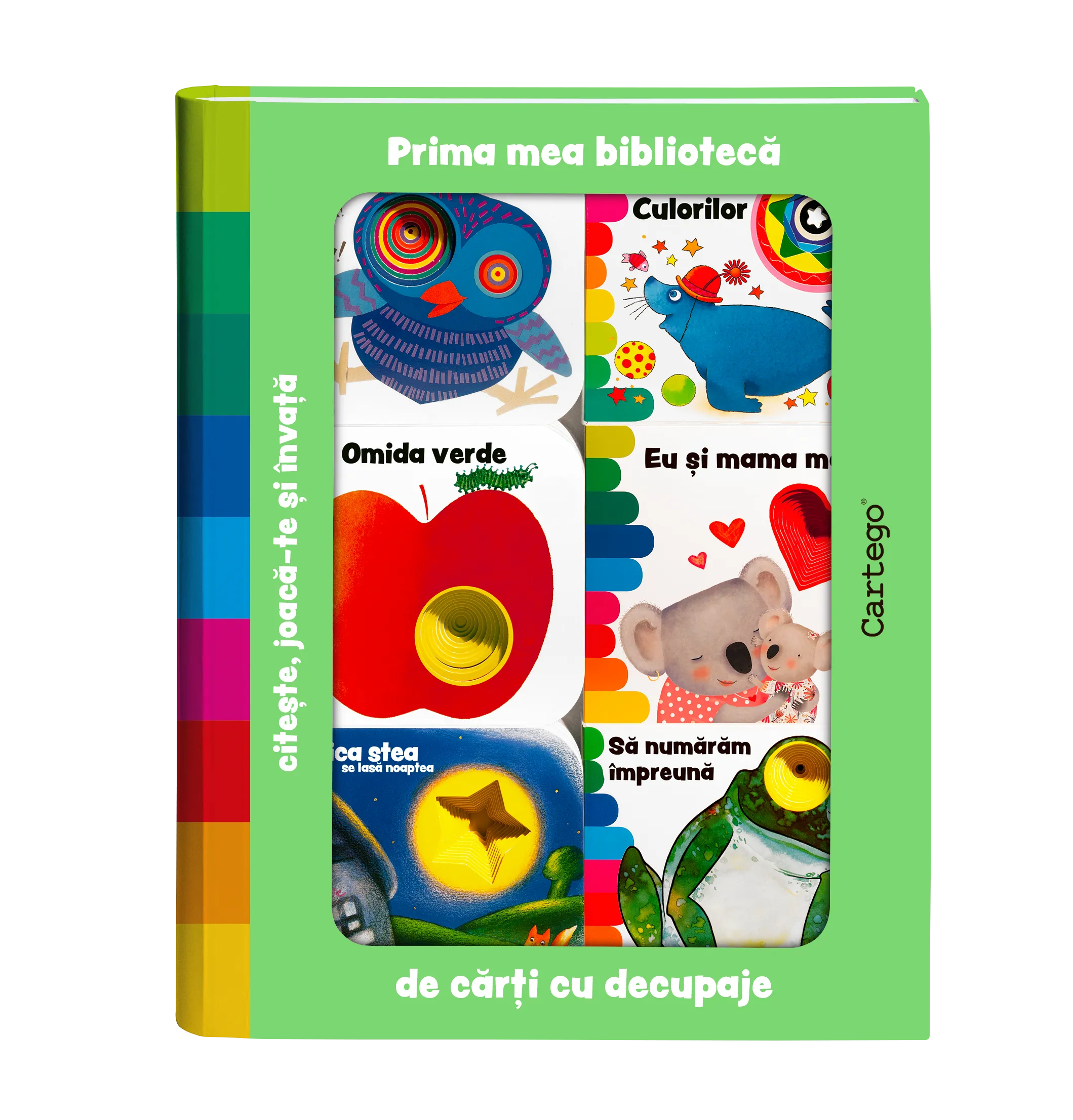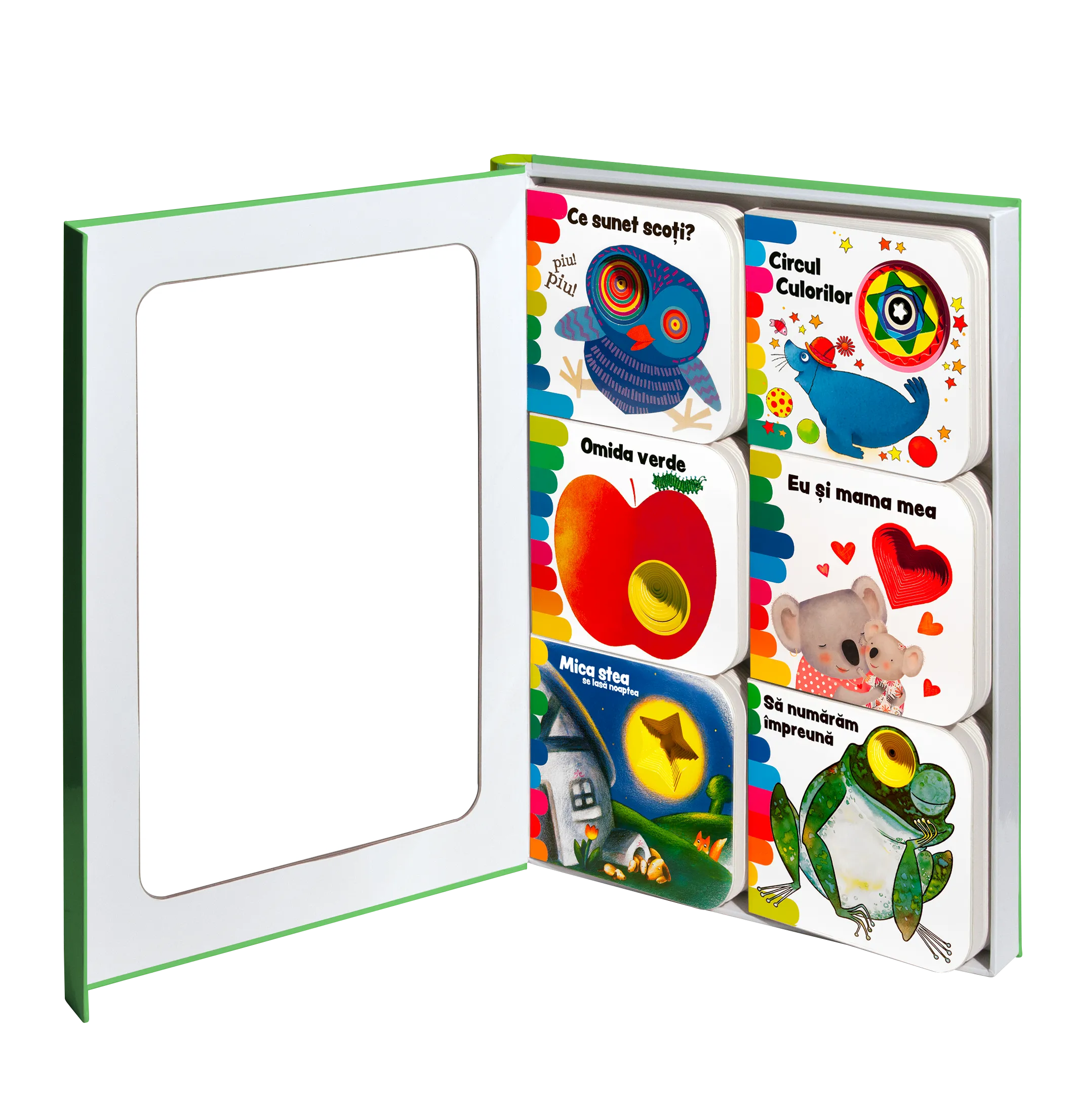 Citește, joacă-te și învață.nnDescoperă cele șase cărți interactive, îndrăgite de copii, în acest format mic cum sunt și mânuțele lor.nncomponență: 6 cărțulii, a câte 24 pagini cartonate.nnOmida verde – proiect și ilustrații Giorgio Vanetti. Ce sunet scoți – proiect și ilustrații Giulia Orecchia. Circul culorilor – proiect și ilustrații Emanuela Bussolati. Să numărăm împreună – proiect Emanuela Bussolati și ilustrații Carlo Alberto Michelini. Eu și mama mea – proiect Gabriele Clima și ilustrații Donata Montanari. Mica stea – proiect Emanuela Bussolati și ilustrașii Antonella Abbatiello.nnRedactare Victor Fală